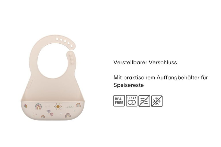 Das Lätzchen schützt die Kleidung beim Essen. Mit bequemer Passform, verstellbarem Verschluss und Auffangschale für verschüttetes Essen. Langlebig und leicht zu reinigen.